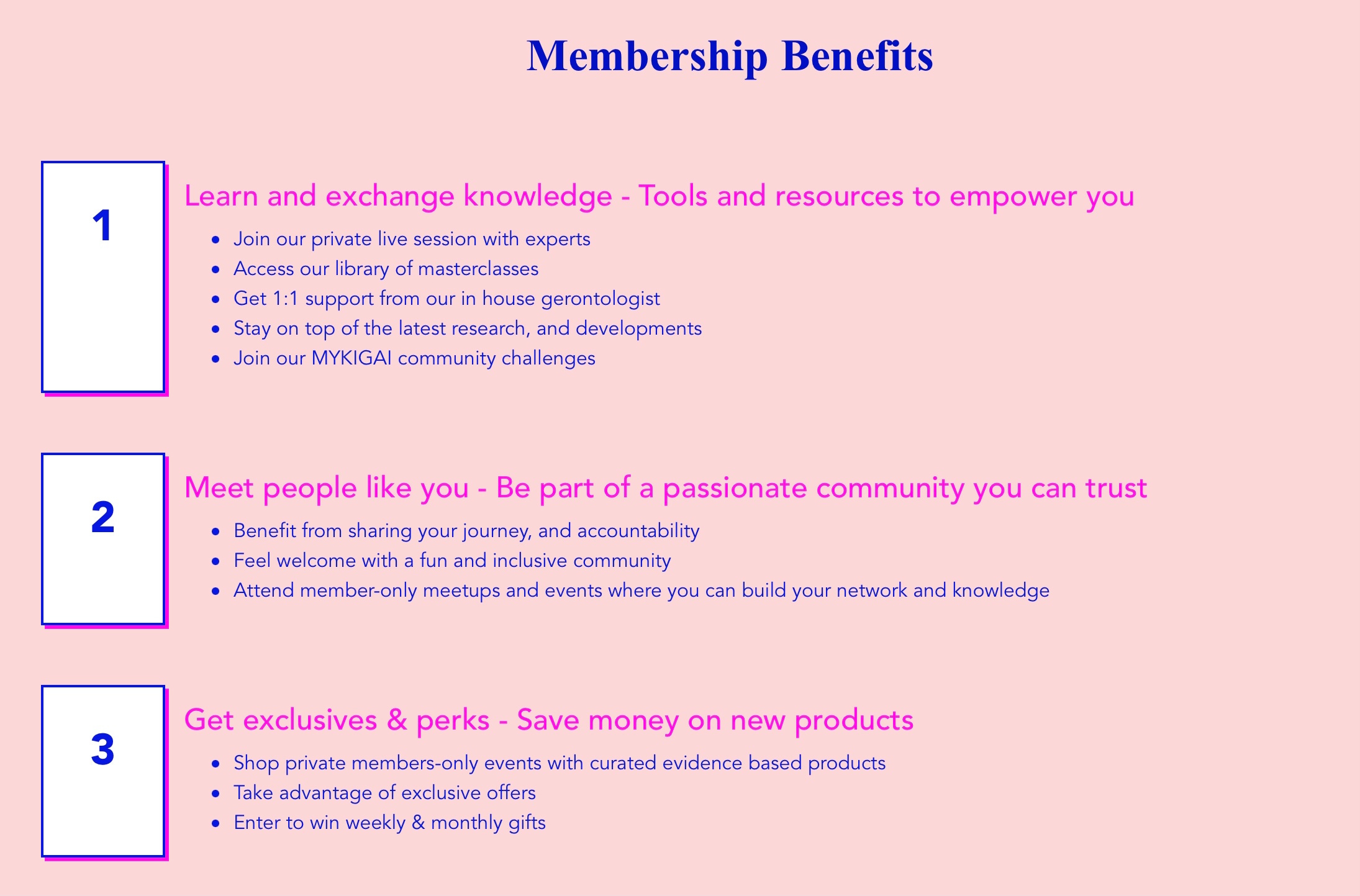 What does MYKIGAI offer? Community, Education, an Interactive experience. We have also done our research, chosen evidence-based brands around the world to secure promotions and always-on discounts for our members. You can try for the first companies that you are curious about, as well as learn about what science is involved. Over our various âLongevity dropâ promotions you will save hundreds of dollars, more importantly, you can share your longevity journey.